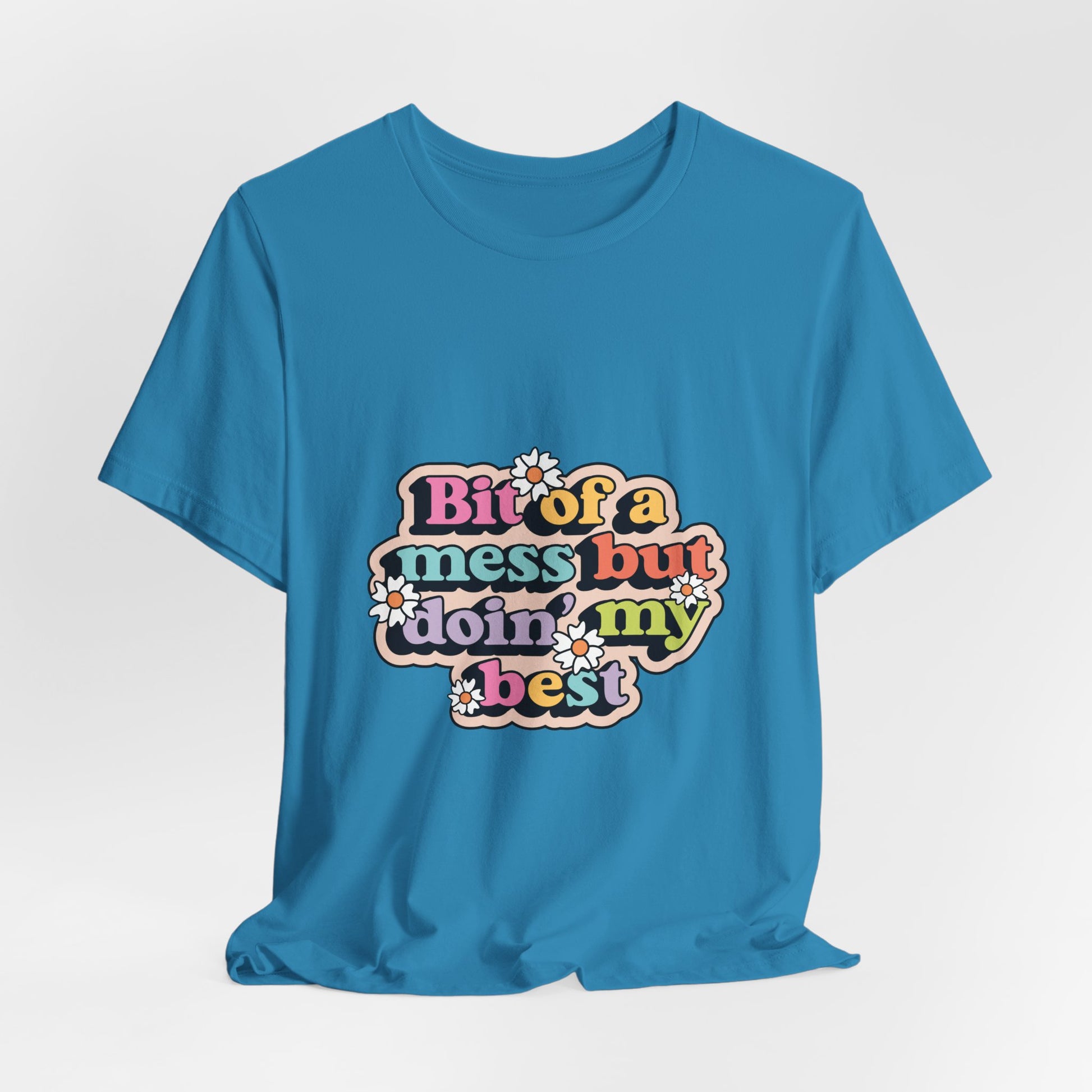 Embrace the chaos with this relatable and humorous t-shirt. The "Bit of a Mess, But Doin' My Best" design is a playful reminder that it's okay to be imperfect and that we're all just trying our best.