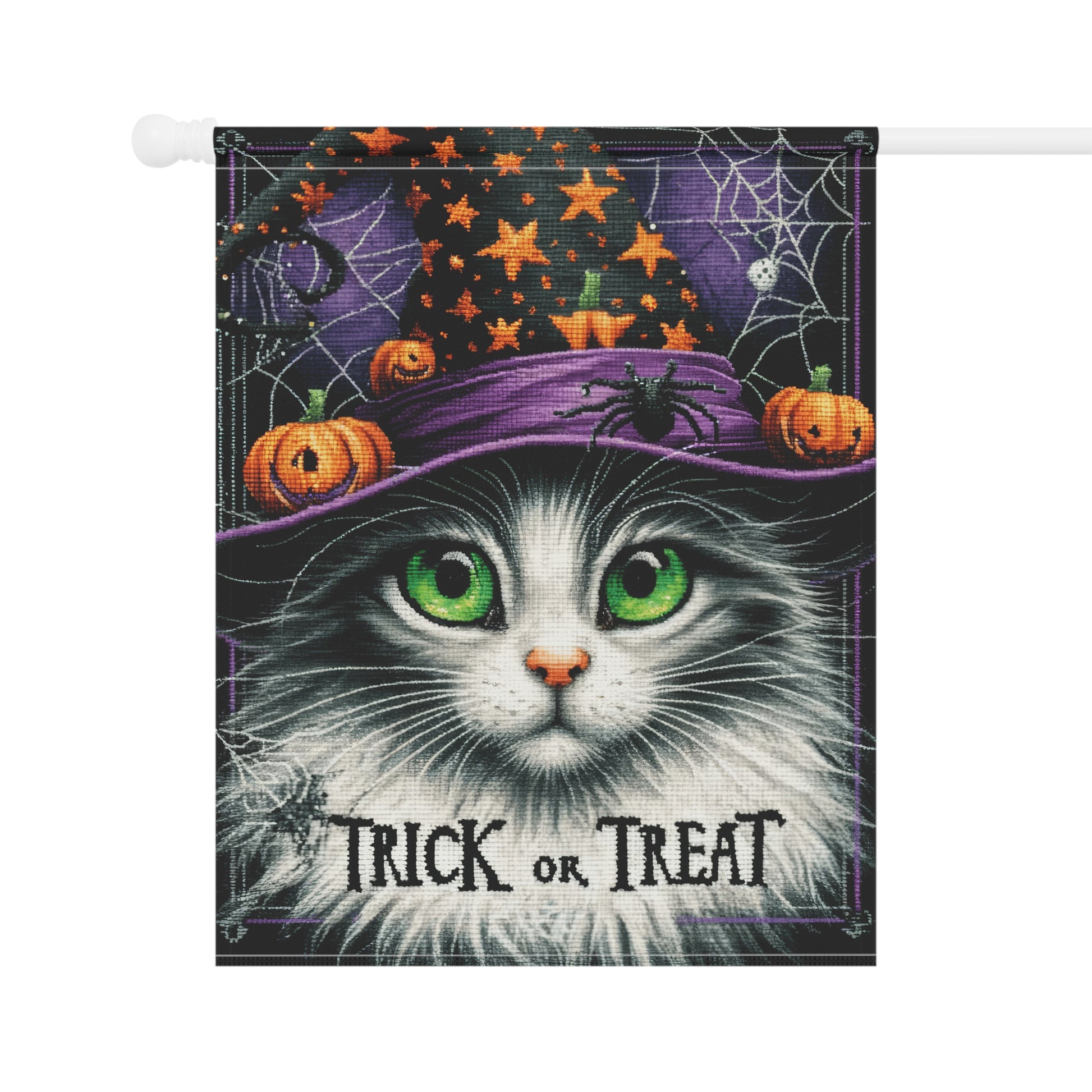 Get ready for some spooktacular fun with our **Trick or Treat Outdoor Banner**! 🕷️🎃 Featuring an adorable graphic of a playful cat donning a witch's hat, surrounded by whimsical spider webs, this banner is the perfect way to greet all the little ghosts and goblins this Halloween season!
