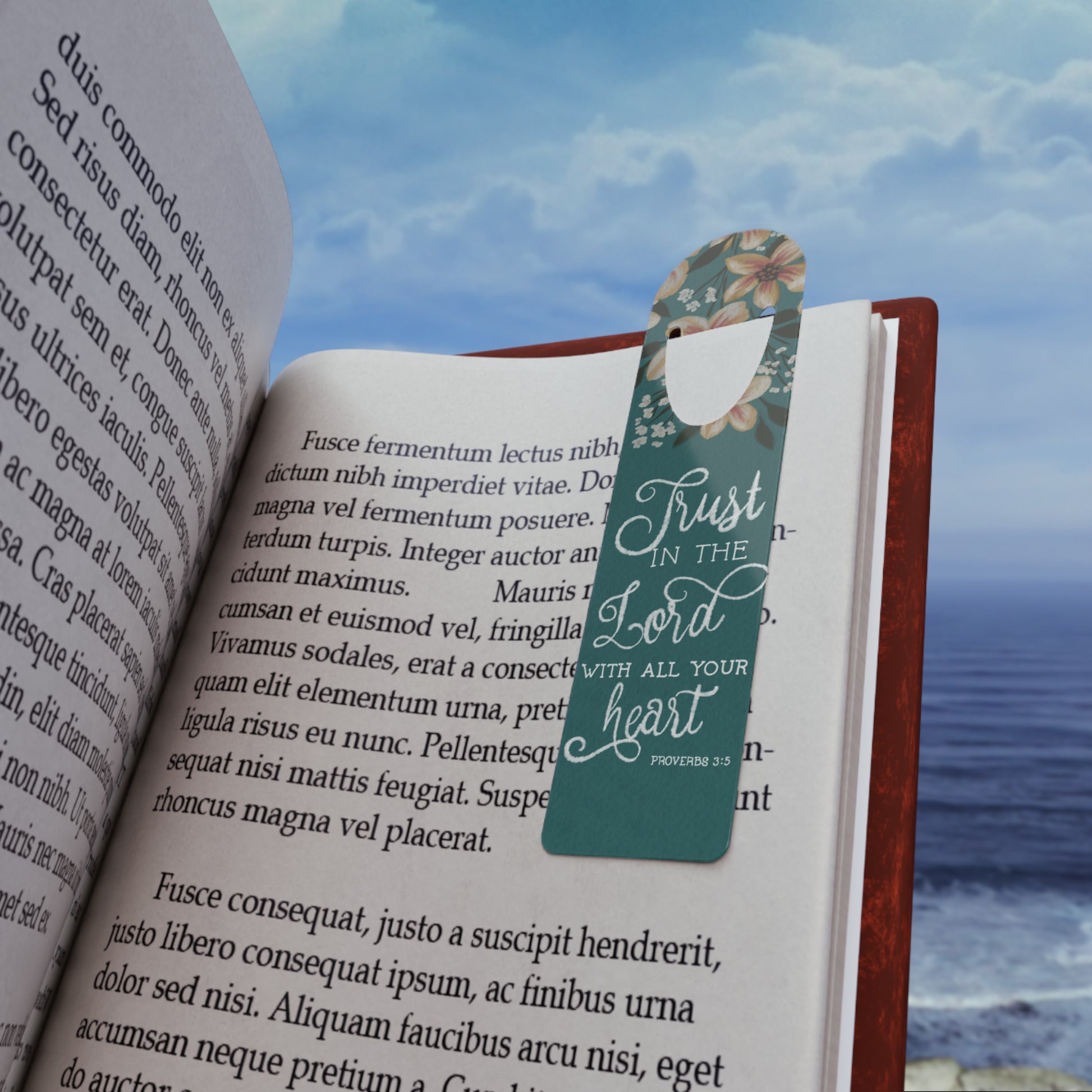 Adorned with the powerful scripture, "Trust In The Lord With All Your Heart," this bookmark serves as a daily reminder to rely on faith and embrace the journey ahead. The thoughtfully designed slot at the top securely holds your page, ensuring you’ll never lose your place as you reflect on the words of wisdom.