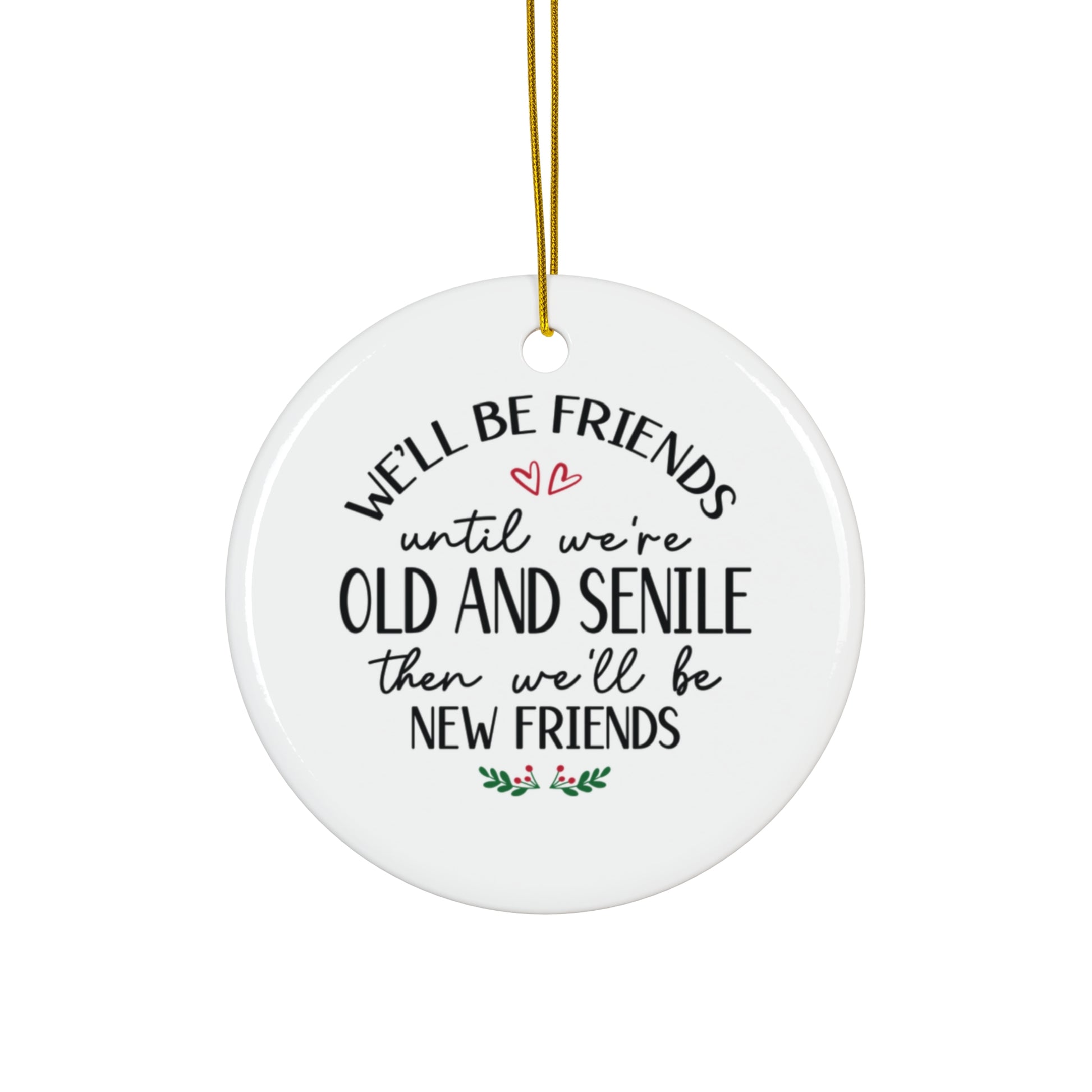 Celebrate your timeless friendship with our charming ceramic "We'll Be Friends Ornament"! 🎄❤️ This delightful piece features the whimsical phrase, "We'll be friends until we're old and senile then we'll be new friends," perfectly capturing the joy and laughter that comes with lifelong companionship!